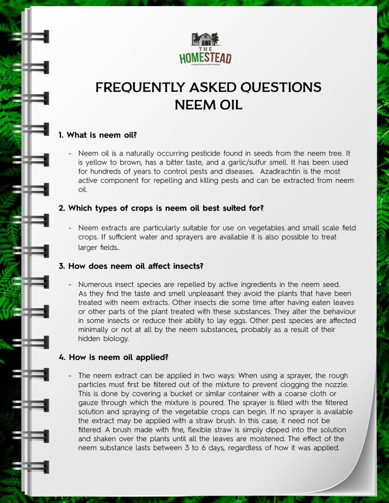 1. What is neem oil? -Neem oil is a naturally occurring pesticide found in seeds from the neem tree. It is yellow to brown, has a bitter taste, and a garlic/sulfur smell. It has been used for hundreds of years to control pests and diseases. Azadirachtin is the most active component for repelling and killing pests and can be extracted from neem oil. 2. Which types of crops is neem oil best suited for? -Neem extracts are particularly suitable for use on vegetables and small scale field crops. If sufficient water and sprayers are available it is also possible to treat larger fields.. 3. How does neem oil affect insects? -Numerous insect species are repelled by active ingredients in the neem seed. As they find the taste and smell unpleasant they avoid the plants that have been treated with neem extracts. Other insects die some time after having eaten leaves or other parts of the plant treated with these substances. They alter the behaviour in some insects or reduce their ability to lay eggs. Other pest species are affected minimally or not at all by the neem substances, probably as a result of their hidden biology. 4. How is neem oil applied? -The neem extract can be applied in two ways: When using a sprayer, the rough particles must first be filtered out of the mixture to prevent clogging the nozzle. This is done by covering a bucket or similar container with a coarse cloth or gauze through which the mixture is poured. The sprayer is filled with the filtered solution and spraying of the vegetable crops can begin. If no sprayer is available the extract may be applied with a straw brush. In this case, it need not be filtered. A brush made with fine, flexible straw is simply dipped into the solution and shaken over the plants until all the leaves are moistened. The effect of the neem substance lasts between 3 to 6 days, regardless of how it was applied.